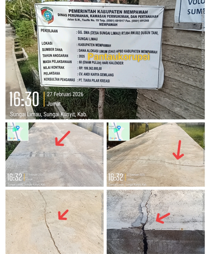MEMPAWAH, – Proyek rabat beton di Gang SMA Desa Sungai Limau Kabupaten Mempawah yang baru beberapa bula selesai dikerjakan kondisi fisiknya sudah mengalami retak dan pecah bahkan batu pasirnya tampak bertimbulan.