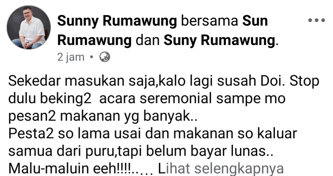 Kritik tersebut disampaikan secara terbuka oleh Sunny Rumawung melalui akun Facebook pribadinya. Dalam unggahannya, ia menyoroti kebiasaan tetap menggelar acara seremonial dan pemesanan makanan dalam jumlah besar, sementara kewajiban pembayaran diduga belum dilunasi.