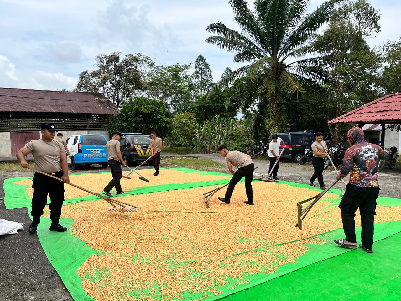 Dukung Ketahanan Pangan, Personil Polres Melawi Lakukan Penjemuran Jagung di Sela-sela Pekerjaan Kantor