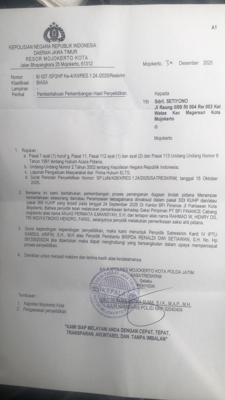 Penanganan dugaan tindak pidana perampasan kemerdekaan dan pemerasan yang dilaporkan terjadi di Kantor BFI Finance Cabang Mojokerto kini menjadi sorotan publik. Pasalnya, meski peristiwa terjadi sejak 24 September 2025, hingga akhir Desember perkara tersebut masih berkutat di tahap penyelidikan.