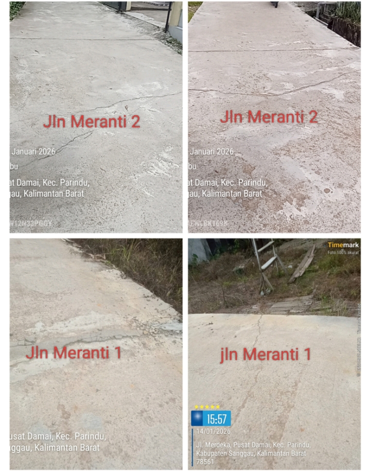 Kalbar, Sanggau: Masyarakat bingung melihat Jalan Rabat Beton di Meranti 2 Dusun Saranrong Desa Pusat Damai Kabupaten Sanggau, yang belum genap setahun, kondisi fisiknya sudah mengalami retak dan pecah. Bahkan batu pasirnya tampak bertimbulan.