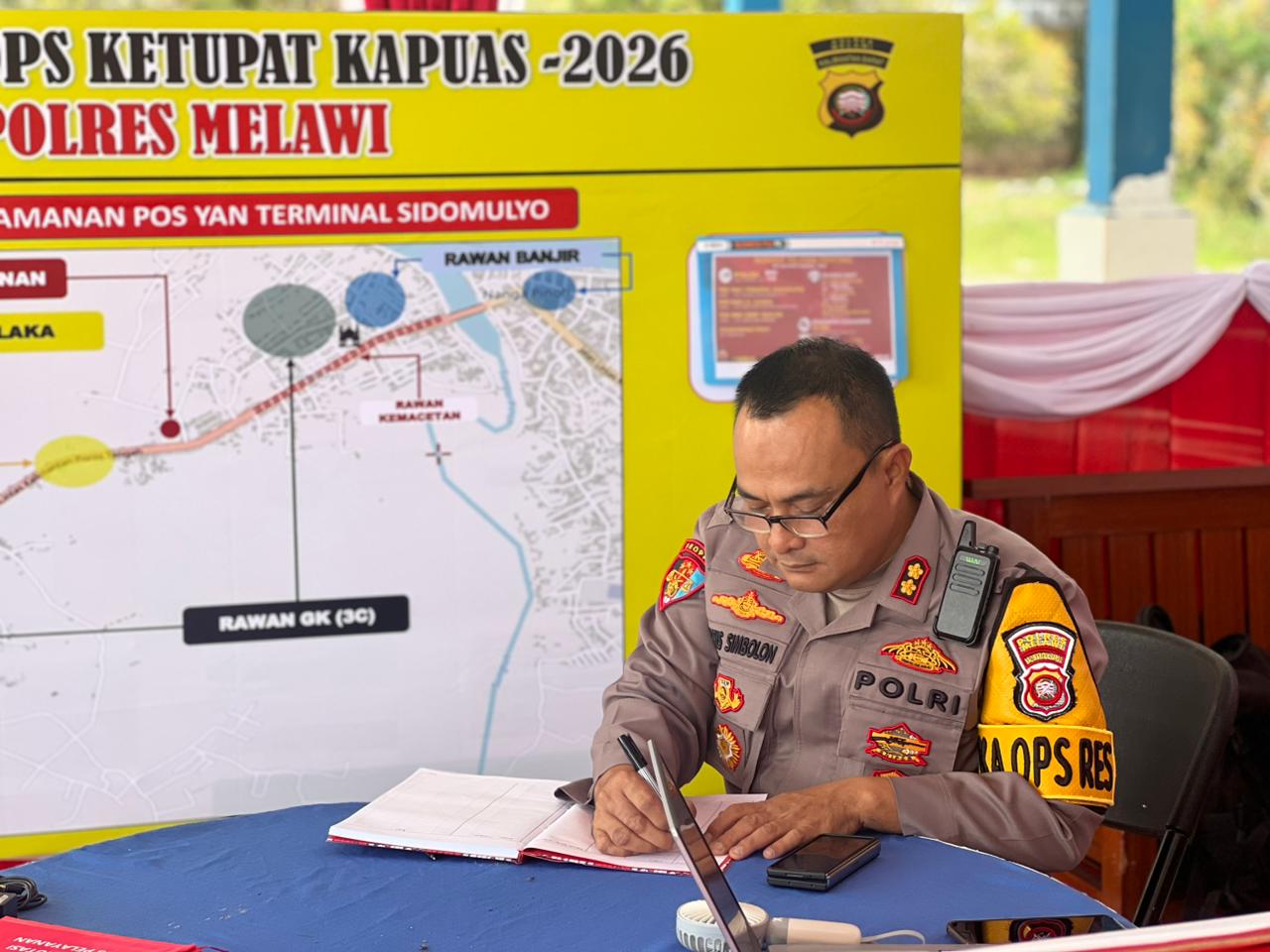 Polres Melawi Polda Kalbar – Kapolres Melawi AKBP Harris Batara Simbolon, S.I.K., S.H., M.Tr.Opsla selaku Ka Ops Terpusat Ketupat Kapuas 2026 di dampingi Kasat Lantas AKP Pipit Supriatna, S.H selaku Kapusdal Ops melaksanakan pemantauan personel yang menempati Pos Pelayanan Terminal AKDP Sidomulyo, Pos Pengamanan yang berada di Pos Lantas dan Pos Pelayanan Tahlud, Sabtu (14/3/26).