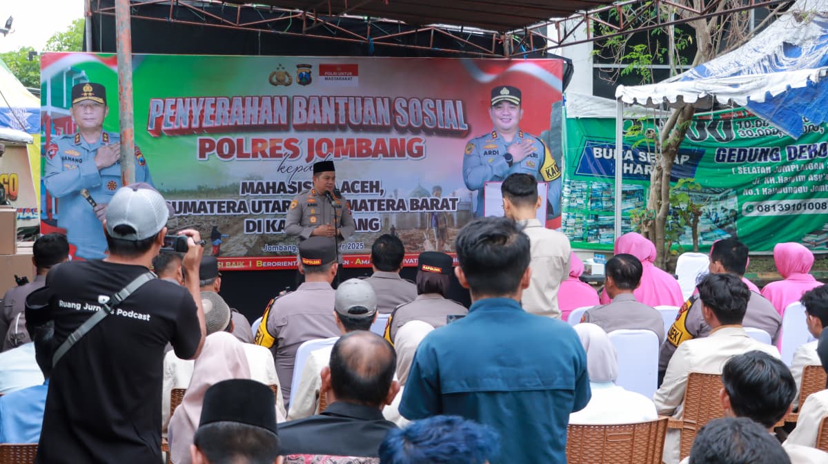 Keluarga Besar Polres Jombang melaksanakan kegiatan pemberian bantuan sosial (bansos) kepada mahasiswa asal Aceh, Sumatera Utara, dan Sumatera Barat yang sedang menempuh pendidikan di Kabupaten Jombang. Kegiatan tersebut dilaksanakan pada Jumat, (19/12/2025), siang, bertempat di Posko Ojol, Jl. KH. Hasyim Asy’ari No. 1, Desa Kaliwungu, Kecamatan Jombang.