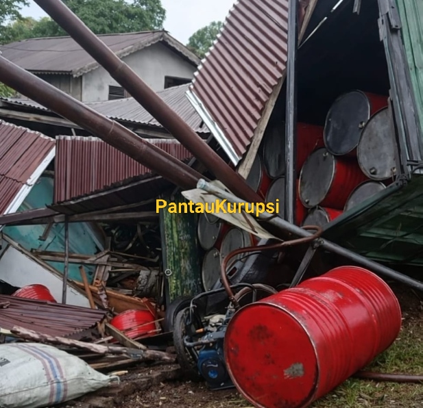 Kalbar, Kapuas, Hulu: Mobil truck muatan puluhan drum BBM subsidi ilegal menabrak tiang listrik dan 2 warung milik warga di Jalan Lintas Selatan, Dusun Bangan Permai, Desa Tanjung Intan, Kecamatan Mentebah, Kabupaten Kapuas Hulu.