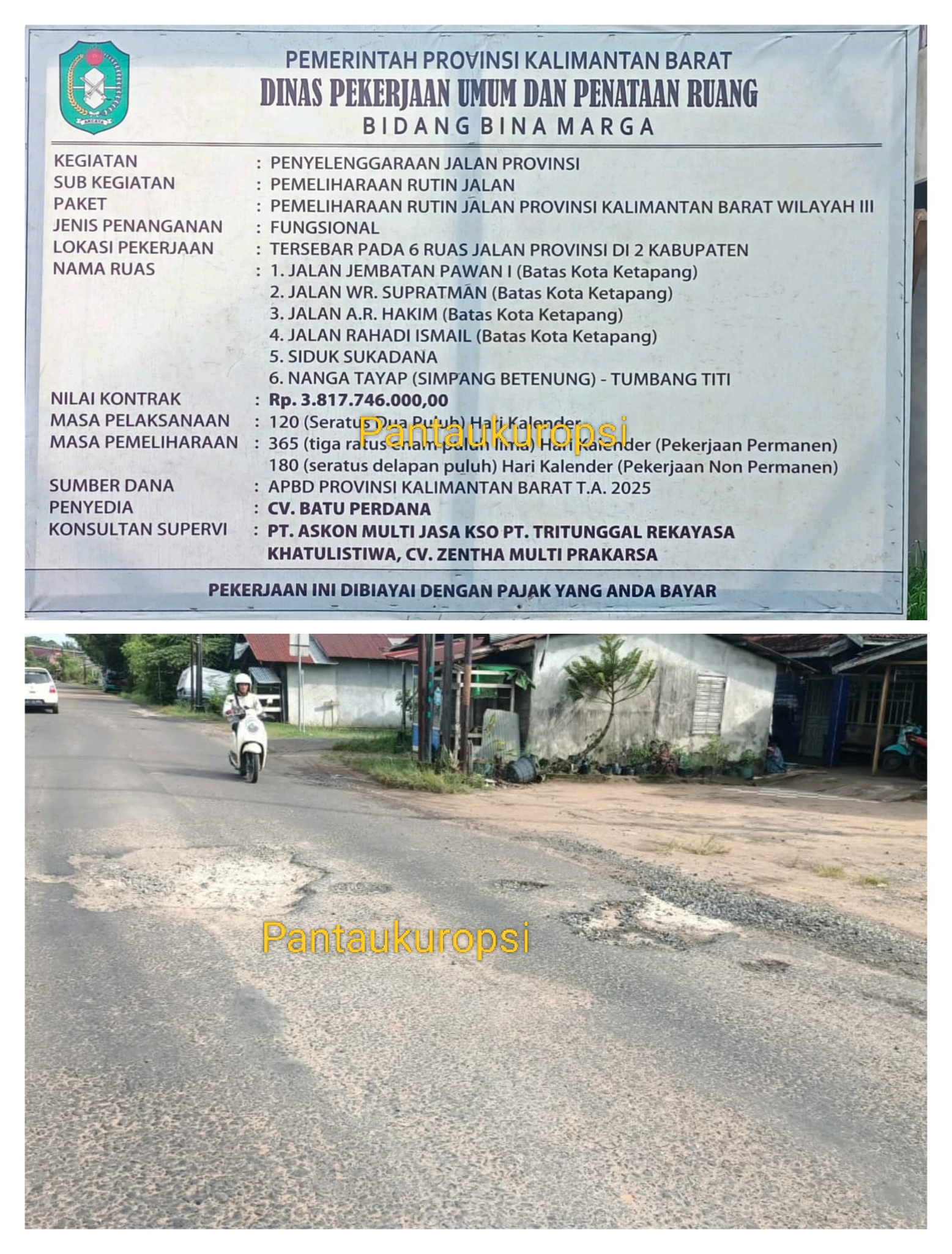Paket daging empuk, pemeliharaan jalan Propinsi Kalimantan Barat Wilayah III sebesar Rp. 3M 800 Juta oleh CV Batu Perdana, realisasinya dituding asal – asalan, melanggar peraturan bestek dan banyak celah can tepi dikedua belah fihak.