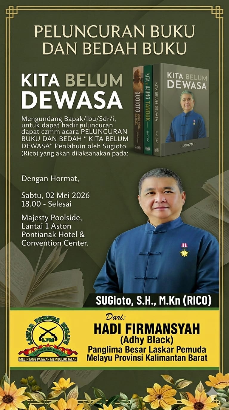 Pontianak, Kalimantan Barat — Panglima Besar Laskar Pemuda Melayu Kalimantan Barat, Adhi Black, secara resmi menyampaikan ucapan selamat kepada Sugioto, SH., M.Kn (Rico) atas terbitnya buku berjudul “Kita Belum Dewasa”, sebuah karya yang mengangkat refleksi mendalam tentang kedewasaan dalam berpikir, bersikap, dan menyikapi realitas kehidupan.