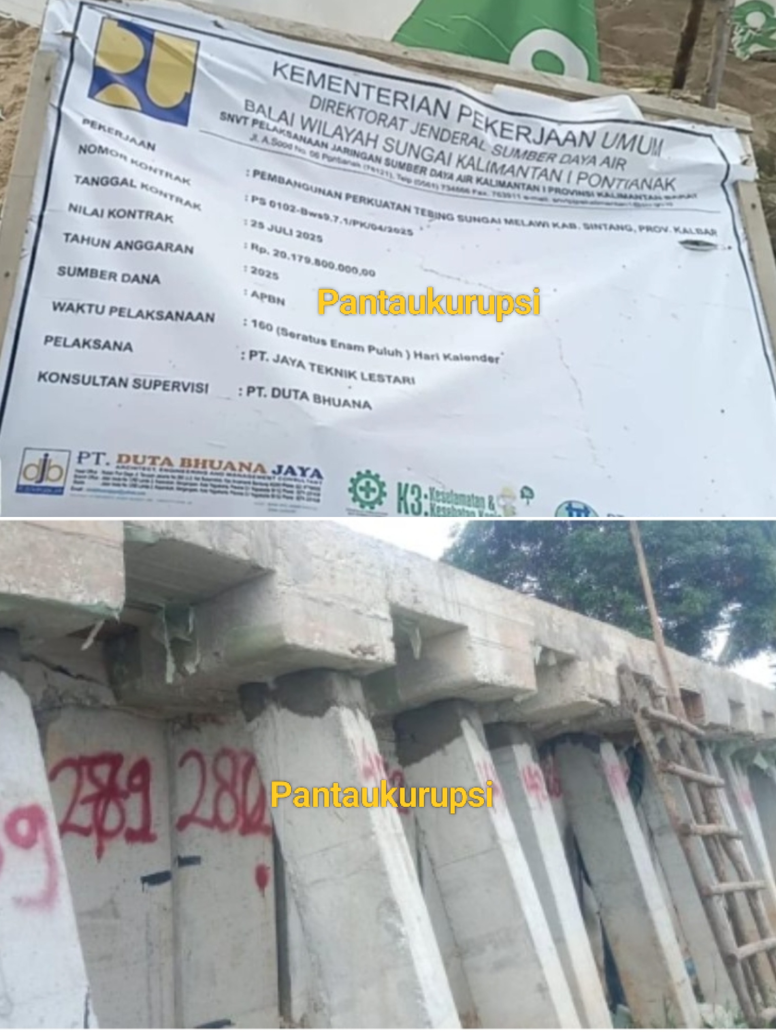 Kalbar, Sintang: Proyek pembangunan tebing Sei Melawi Kabupaten Sintang kembali jadi buah bibir masyarakat. Mereka menilai paket basah kuyup segede Rp. 20 Miliar itu dikerjakan asal asalan, tidak sesuai bestek atau spesifikasi tehnis.