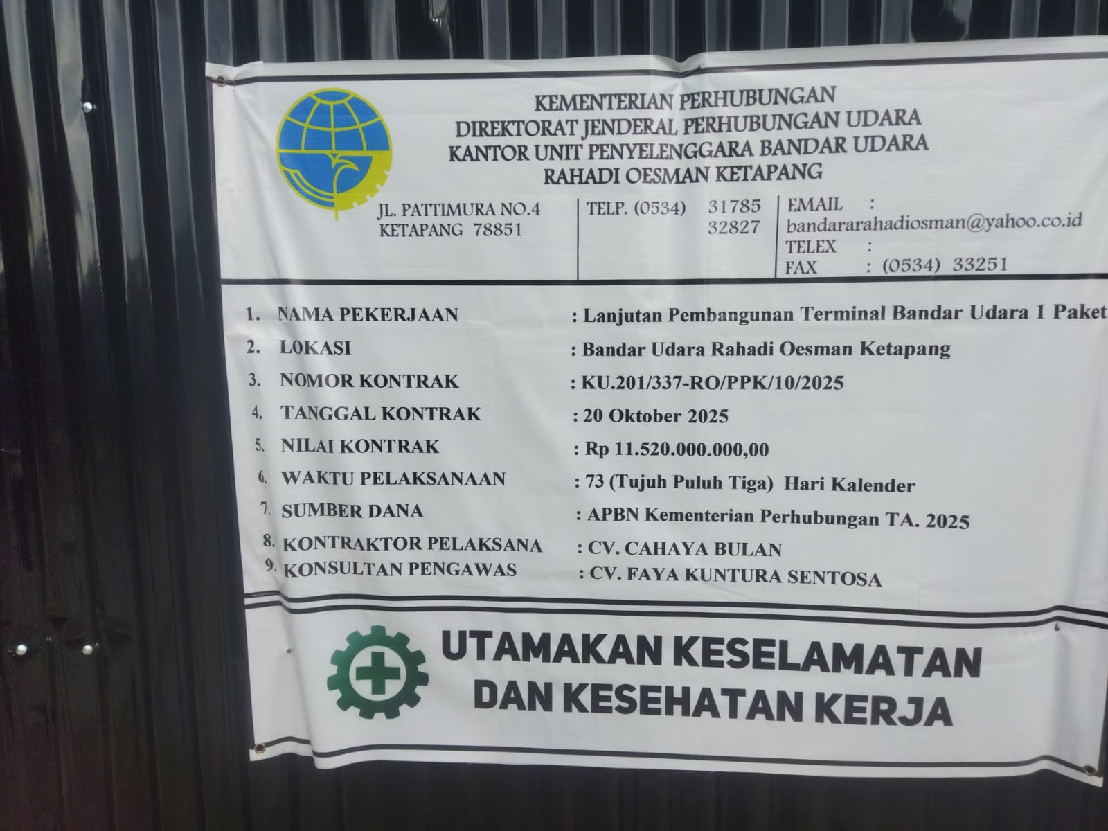 Proyek tersebut merupakan paket pekerjaan konstruksi milik Kementerian Perhubungan melalui Unit Penyelenggara Bandar Udara (UPBU) Rahadi Oesman Ketapang, dengan pagu dan HPS masing-masing sebesar Rp14.400.000.000,00 yang bersumber dari APBN Tahun Anggaran 2025.