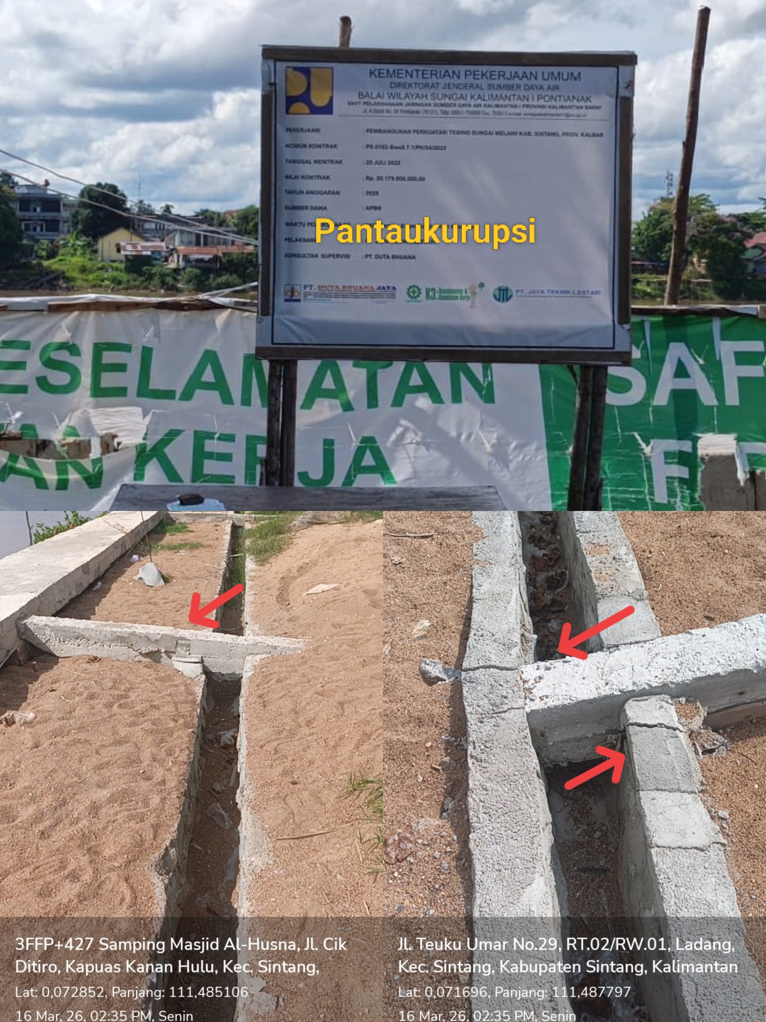 Kalbar, Sintang: Kembali proyek pembangunan tebing Sei Melawi Kelurahan Ladang Kabupaten Sintang, jadi omongan masyarakat. Paket basah kuyup segede Rp. 20 Miliar, milik BWSK 1, kondisi fisiknya sudah berantakan.